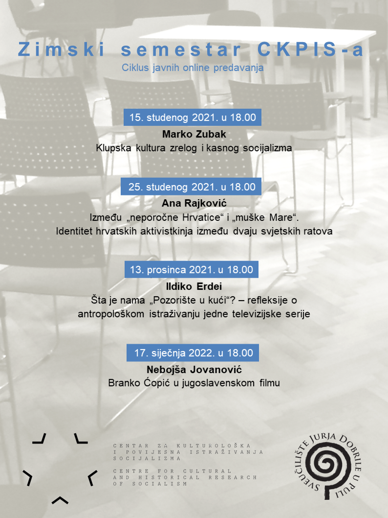 U ciklusu online javnih predavanja pod nazivom Zimski semestar CKPIS-a od studenog do siječnja nastupit će četiri gostujuća predavača: Marko Zubak (Hrvatski institut za povijest u Zagrebu), Ana Rajković Pejić (Hrvatski institut za povijest, Podružnica za povijest Slavonije, Srijema i Baranje u Slavonskom Brodu), Ildiko Erdei (Filozofski fakultet u Beogradu) i Nebojša Jovanović (Akademija scenskih umjetnosti u Sarajevu).