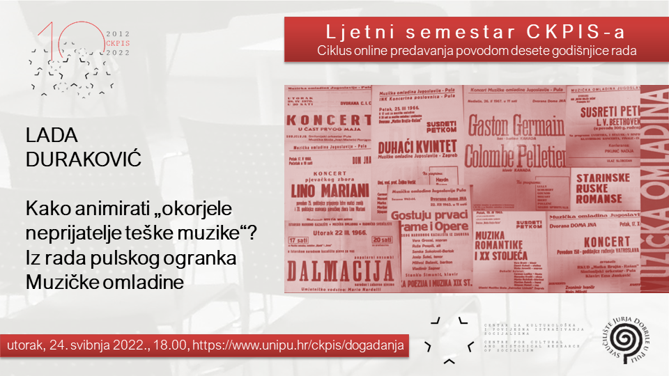 U ciklusu predavanja Ljetni semestar CKPIS-a Lada Duraković nastupa s temom Kako animirati „okorjele neprijatelje teške muzike“? Iz rada pulskog ogranka Muzičke omladine. Predavanje će se održati u utorak, 24. svibnja 2022., u 18.00 sati u virtualnoj dvorani https://ovh.unipu.hr/b/lad-fcf-rpe-ydv.