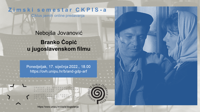 Četvrti i posljednji gost Zimskog semestra CKPIS-a je Nebojša Jovanović, asistent na Odsjeku za produkciju Akademije scenskih umjetnosti u Sarajevu, koji će govoriti na temu Branko Ćopić u jugoslavenskom filmu. Predavanje će se održati u ponedjeljak, 17. siječnja 2022., u 18.00 sati u virtualnoj dvorani https://ovh.unipu.hr/b/and-gdp-arf.