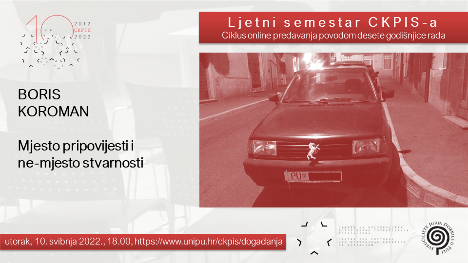 U ovogodišnjem Ljetnom semestru CKPIS-a, ciklusu predavanja povodom desete godišnjice Centra, peti je predavač Boris Koroman s temom Mjesto pripovijesti i ne-mjesto stvarnosti. Predavanje će se održati u utorak, 10. svibnja 2022., u 18.00 sati u virtualnoj dvorani https://ovh.unipu.hr/b/lad-fcf-rpe-ydv.