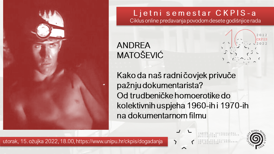 Ciklus online predavanja Ljetni semestar CKPIS-a, kojim se ove godine obilježava deseta godišnjica rada Centra, otvara Andrea Matošević s temom Kako da naš radni čovjek privuče pažnju dokumentarista? Od trudbeničke homoerotike do kolektivnih uspjeha 1960-ih i 1970-ih na dokumentarnom filmu. Predavanje će se održati u utorak, 15. ožujka 2022., u 18.00 sati u virtualnoj dvorani https://ovh.unipu.hr/b/and-
