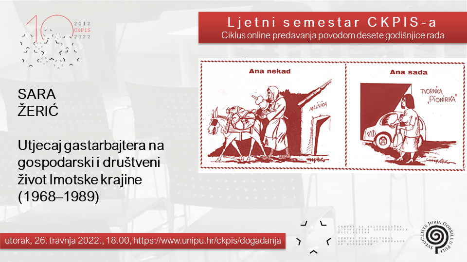 Najmlađa suradnica CKPIS-a Sara Žerić, doktorandica na Sveučilištu u Regensburgu, u ciklusu Ljetni semestar CKPIS-a nastupa s temom Utjecaj gastarbajtera na gospodarski i društveni život Imotske krajine (1968–1989). Predavanje će se održati u utorak, 26. travnja 2022., u 18.00 sati u virtualnoj dvorani https://ovh.unipu.hr/b/and-