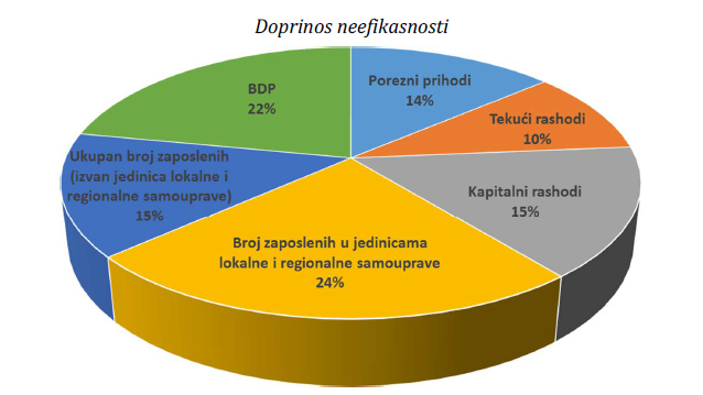 Usporedna efikasnost 21 hrvatske županije u razdoblju 2002.-2015. empirijski je ocijenjena neparametarskim pristupom, na temelju međusobne usporedbe BDP-a, poreznih prihoda, tekućih rashoda, kapitalnih rashoda, broja zaposlenih u jedinicama lokalne i regionalne samouprave, te ukupnog broja zaposlenih umanjenog za zaposlene u tijelima lokalne i regionalne samouprave i kod korisnika proračuna. Rezultati istraživanja potvrdili su hipotezu o značajnom pozitivnom odstupanju Grada Zagreba od ostalih županija, kao i hipotezu o prevelikom broju zaposlenih u jedinicama lokalne i regionalne samouprave kao glavnom izvoru neefikasnosti (slika).