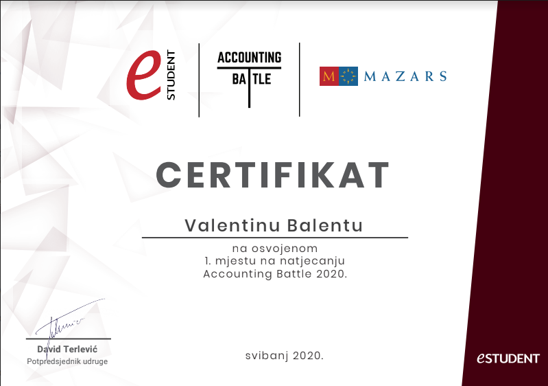 Accounting Battle studentima pruža priliku da znanje stečeno kroz fakultetsko obrazovanje primijene za rješavanje stvarnih poslovnih slučajeva. Natjecanje se ove godine odvijalo u digitalnom obliku od 4. do 23. svibnja, a sastojalo se od tri kruga. U prvom su krugu natjecatelji odgovarali na pitalice iz područja računovodstvene teorije. Drugi je krug bio predviđen za rješavanje case study, a naš je Valentino imao temu iz područja analize financijskih izvještaja. U trećem je krugu sudjelovao na virtualnom poslovnom sastanku na kojem je morao riješiti poslovni problem iz područja poznavanja poreznih zakona.