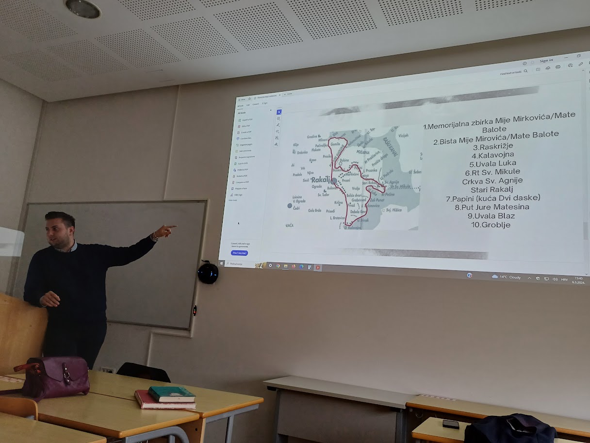 Matteo Legović, apsolvent Kulture i turizma, prezentirao je zainteresiranim kolegama proces kreiranja rute "Tragom Mije Mirkovića/Mate Balote", koju je s kolegicom Katarinom Bratulić, magistrom Kulture i turizma predstavio na znanstvenom skupu Susreti na dragom kamenu. Na temelju istraživanja stavova javnosti i uz konzultacije sa stručnjacima, nakon temeljitog iščitavanja literature, kroz nekoliko terenskih obilazaka uspješno su trasirali kulturnu rutu, koja tematizira život i djela najpoznatijeg Rakljanca. Studenti FET-a imat će priliku novu rutu obići već ovog proljeća.