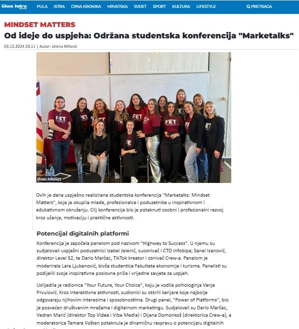 29. studenoga 2024. studenti Marketinga organizirali su konferenciju Marketalks: Mindset Matters. Konferencija se održava već četvrtu godinu za redom, a ovogodišnje izdanje je u prepunoj dvorani, tijekom tri sata bogatog i inspirativnog programa, okupilo brojne pulske učenike i studente koji su slušali priče o uspjehu, istražili vlastite ambicije te stekli vrijedna znanja za osobni i profesionalni razvoj. Saznajte više detalja u nastavku i pogledajte fotogaleriju.