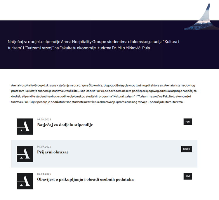 Naš dugogodišnji partner, Arena Hospitality Group (AHG) otvorila je natječaj za dodjelu stipendija studentima druge godine diplomskog studija Poslovne ekonomije, smjer Turizam i razvoj, te druge godine diplomskog studijskog programa Kultura i turizam. Kako navodi AHG, cilj stipendije je podržati izvrsne studente u završetku obrazovanja i profesionalnog razvoja u području kulture i turizma.