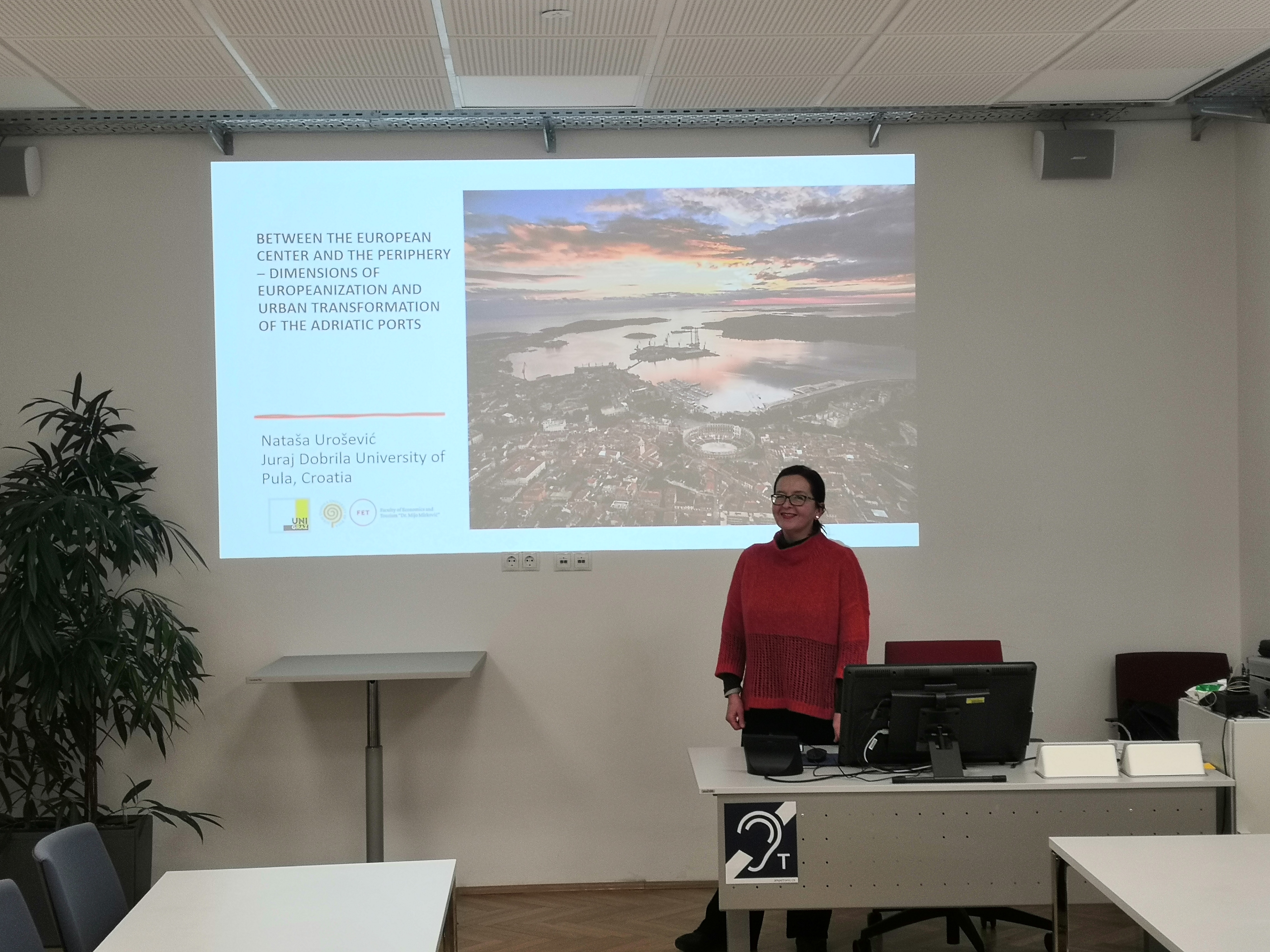 Uloga transnacionalnih kulturnih i znanstvenih transfera u modernizaciji i urbanoj transformaciji jadranskih luka bila je glavna tema pozvanog predavanja koje je izv. prof. dr. sc. Nataša Urošević održala na Sveučilištu u Grazu 21. siječnja 2026. U sklopu aktivnosti istraživačkog klastera Knowledge transfer and Concepts of Europe gostujuća je predavačica predstavila svoj istraživački projekt Between the European center and the periphery: Dimensions of Europeanisation and urban transformation of Adriatic Ports koji se bavi rezultatima procesa urbanizacije, industrijalizacije i modernizacije jadranskih luka na srednjoeuropskim periferijama, kao i utjecajem znanstvenih i kulturnih transfera koji su omogućili razdoblja ubrzanog razvoja, intenzivne proizvodnje i cirkulacije znanja te stvaranja (trans)nacionalnih identiteta.
