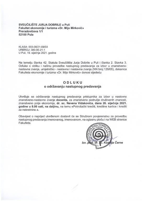 Dekanica FET-a donijela je Odluku o održavanju nastupnog predavanja pristupnika za izbor u naslovno znanstveno-nastavno zvanje docenta, za znanstveno područje društvenih znanosti, znanstveno polje ekonomija, dr. sc. Nevena Vidakovića, dana 26. siječnja 2021. godine u 8 sati, na daljinu, na temu «Potrošački krediti, kreditne kartice i krediti za nekretnine.».