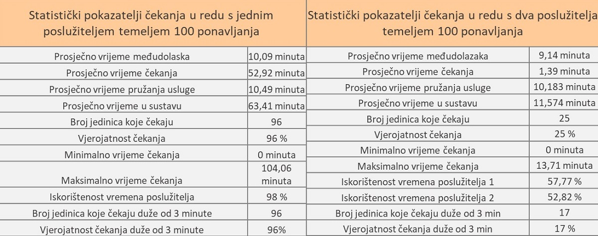 Zaključujemo kako je na temelju 100 pokušaja, prosječno vrijeme čekanja na uslugu preuzimanja pošiljke je oko 1.4 minute, ako postoje dva poslužitelja. Zatim, prosječno vrijeme trajanja usluge iznosi 10 minuta, a prosječno vrijeme koje klijent provede u sustavu je 11.6 minuta. Samo je 25% vjerojatnosti da će klijent čekati na uslugu, a 17 % da će čekati dulje od 3 minute. Iskorištenost vremena za oba poslužitelja je veća od 50%. Iako dolazi do unaprjeđenja usluge iz perspektive klijenata, iskorištenost vremena poslužitelja može biti percipirana kao neučinkovita i ekonomska isplativost uvođenja dodatnog poslužitelja može biti upitna. Ipak, osim što dolazi do značajnog smanjenja prosječnog čekanja, iz perspektive klijenata smatramo da bi ovakav pristup povećao zadovoljstvo klijenata uslugom.