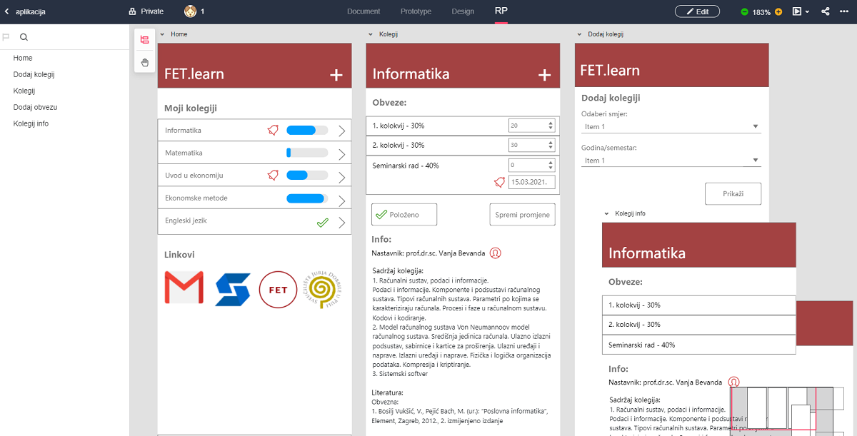 Aplikaciju „FET Learn“ su osmislili i dizajnirali studenti 2. godine smjera „Informatički menadžment“ u sklopu kolegija „Razvoj poslovnih aplikacija“ pod mentorstvom Dr. sc. Gorana Matoševića. Preuzmite i isprobajte mobilnu aplikaciju za evidenciju bodova na kolegijima!
